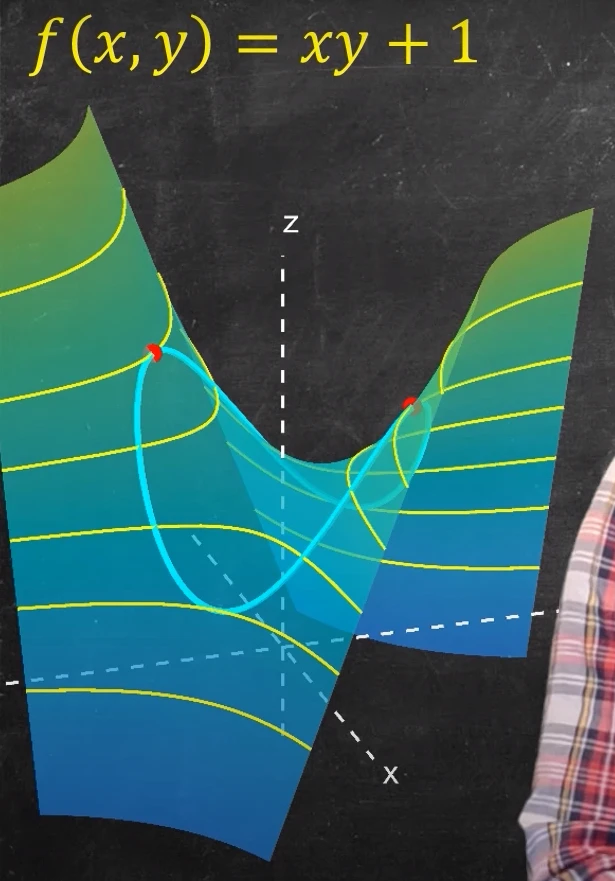 Let the blue line represent the function f with the constraint x² + y² = 1. See the yellow lines that barely kiss the blue lines? Those are going to be where the maximum and minimum values of the function occurs.