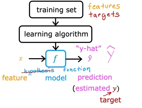 Regression: A type of supervised learning algorithm used to predict new values based on the “true” data. After we give it 50 house size and price value, our function can make a price prediction (y-hat) of a house size of x. (the feature)