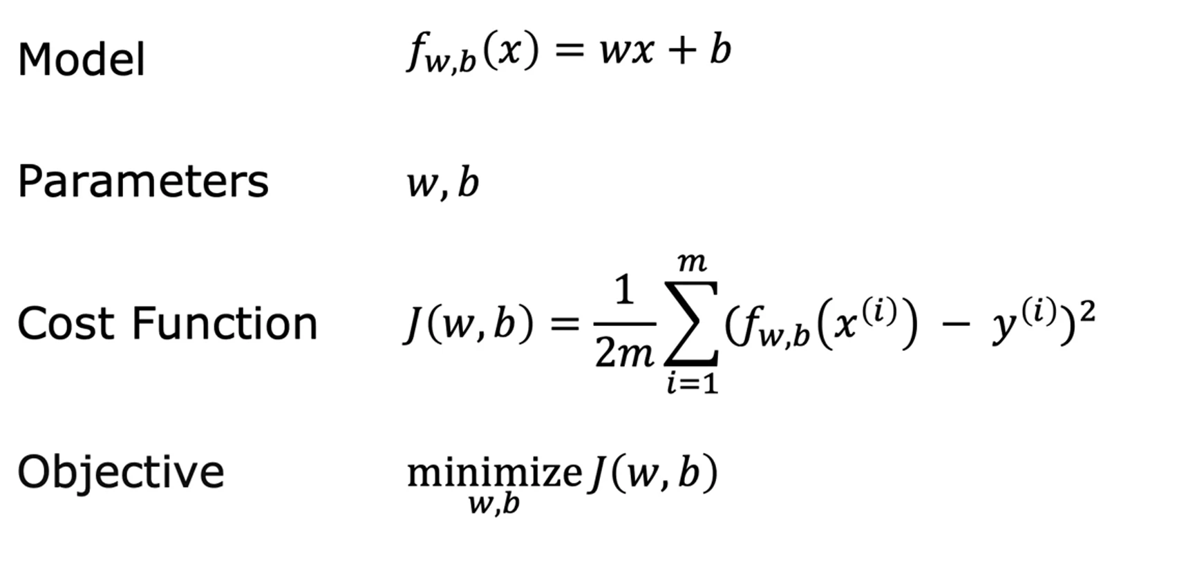 Goal of linear regression is to minimize cost function J. We should have the most appropriate w and b so that J is minimum. For a data that fits perfectly to y =3x, we choose the linear regression function as w = 3 and b = 0 and the error is 0. ! y hat and y is equal.