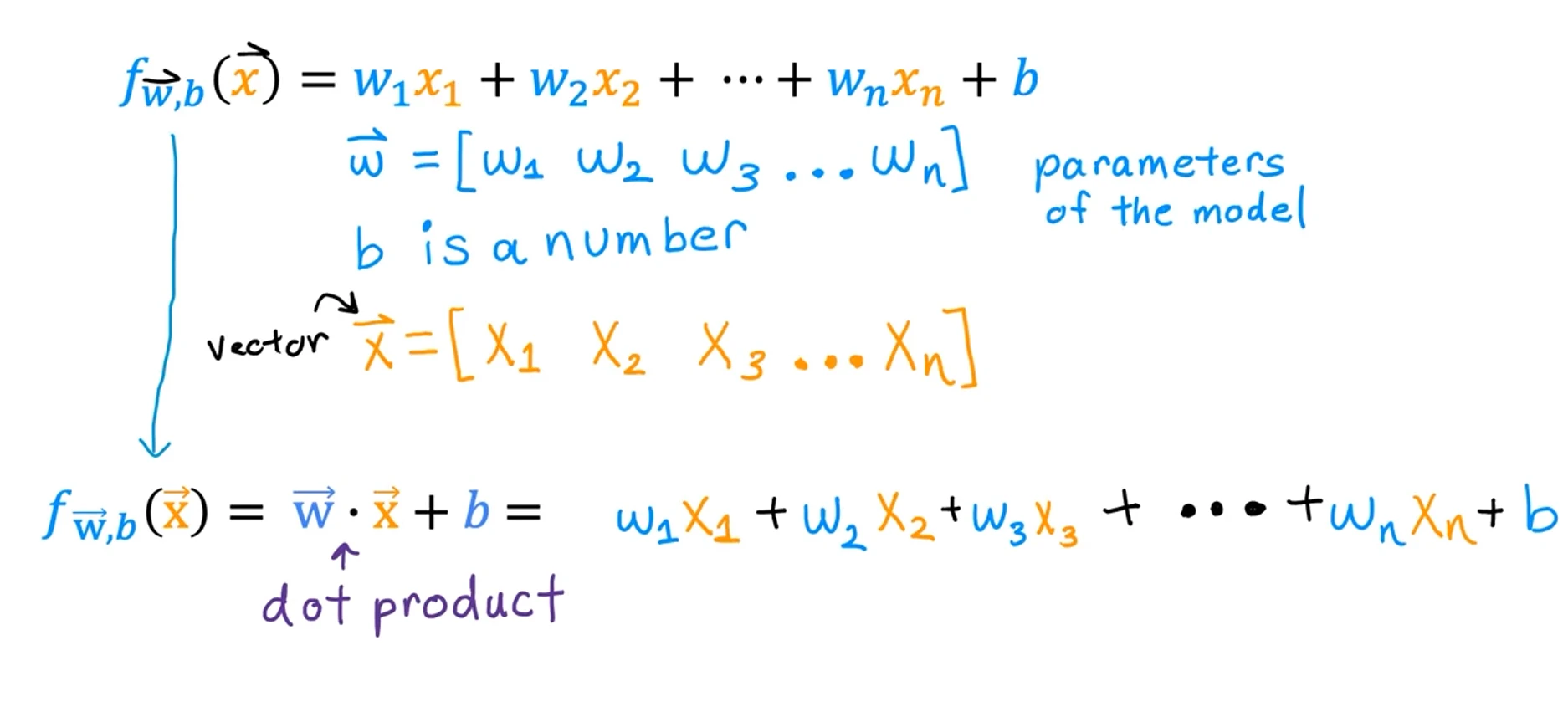 One can represent this function linearly (linear regresison), which seems the most primitive method! Linear regression is univariate, meaning consists of only one variable. We only take our guess by the size of the house, but not for example where it is located and more. A linear regression function is something like wx + b. w and b are parameters of the regression model, adjusted as the model learns from the data. They’re also referred to as “coefficients” or “weights”